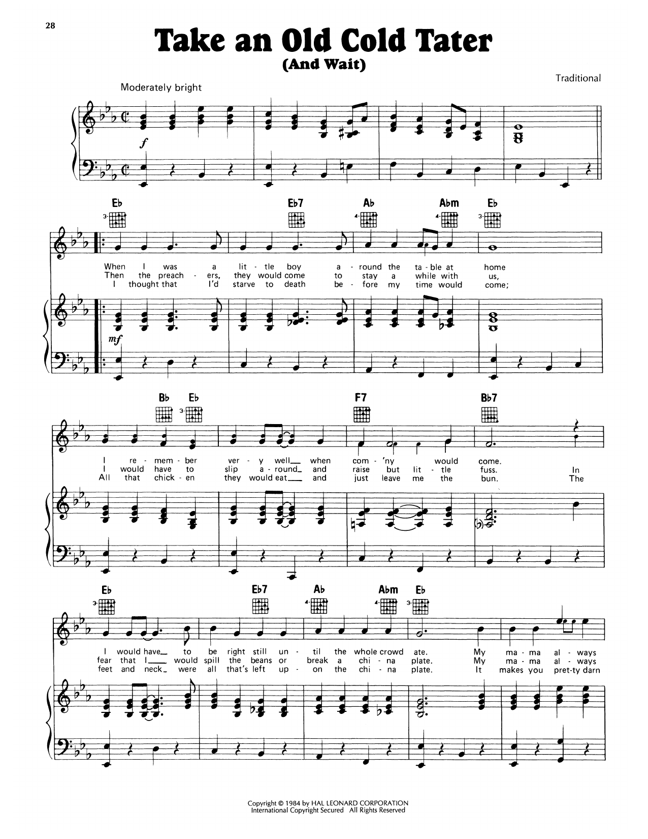 Download or print Traditional Take An Old Cold Tater (And Wait) sheet music, chords and digital score arranged for Piano, Vocal & Guitar Chords (Right-Hand Melody). This Country score includes 2 page(s).