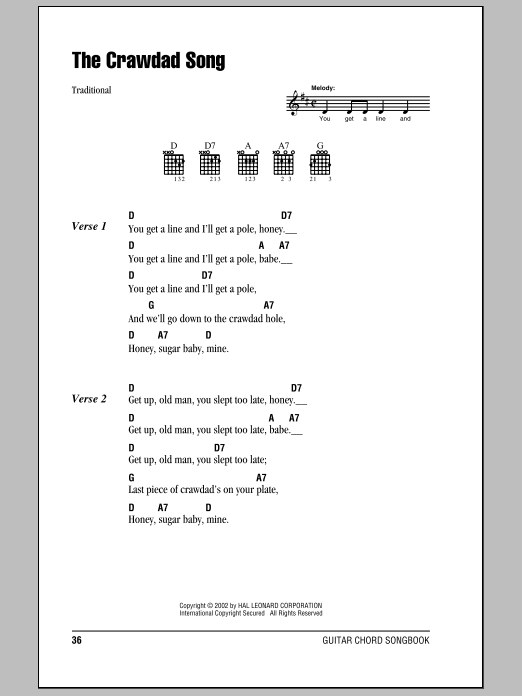 Download or print Traditional The Crawdad Song sheet music, chords and digital score arranged for Piano, Vocal & Guitar Chords (Right-Hand Melody). This Children score includes 2 page(s).