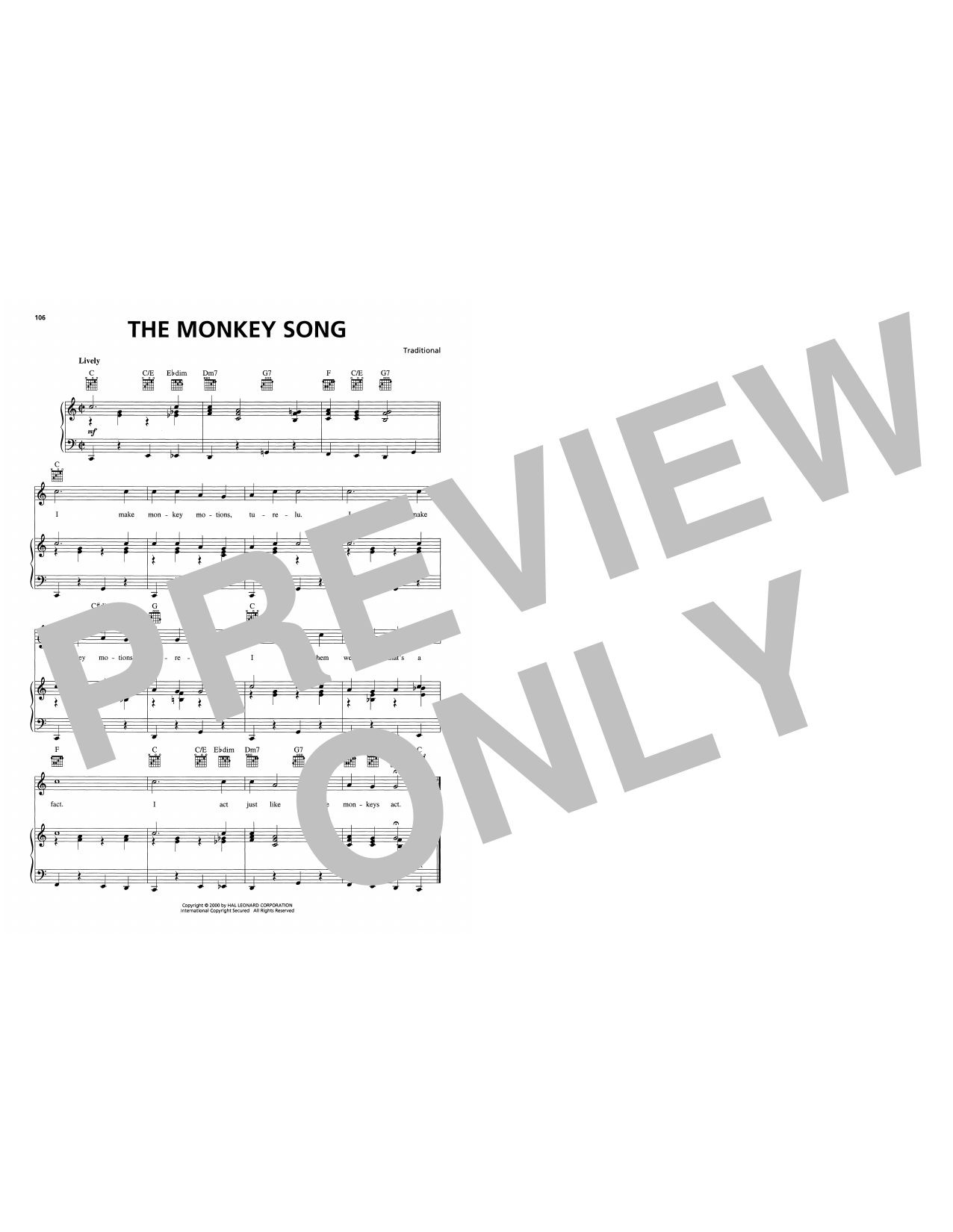 Download or print Traditional The Monkey Song sheet music, chords and digital score arranged for Piano, Vocal & Guitar Chords (Right-Hand Melody). This Children score includes 1 page(s).