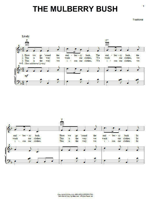 Download or print Traditional The Mulberry Bush sheet music, chords and digital score arranged for Piano, Vocal & Guitar Chords (Right-Hand Melody). This Children score includes 2 page(s).