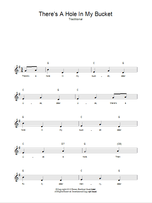 Download or print Traditional There's A Hole In My Bucket sheet music, chords and digital score arranged for Lead Sheet / Fake Book. This Children score includes 2 page(s).