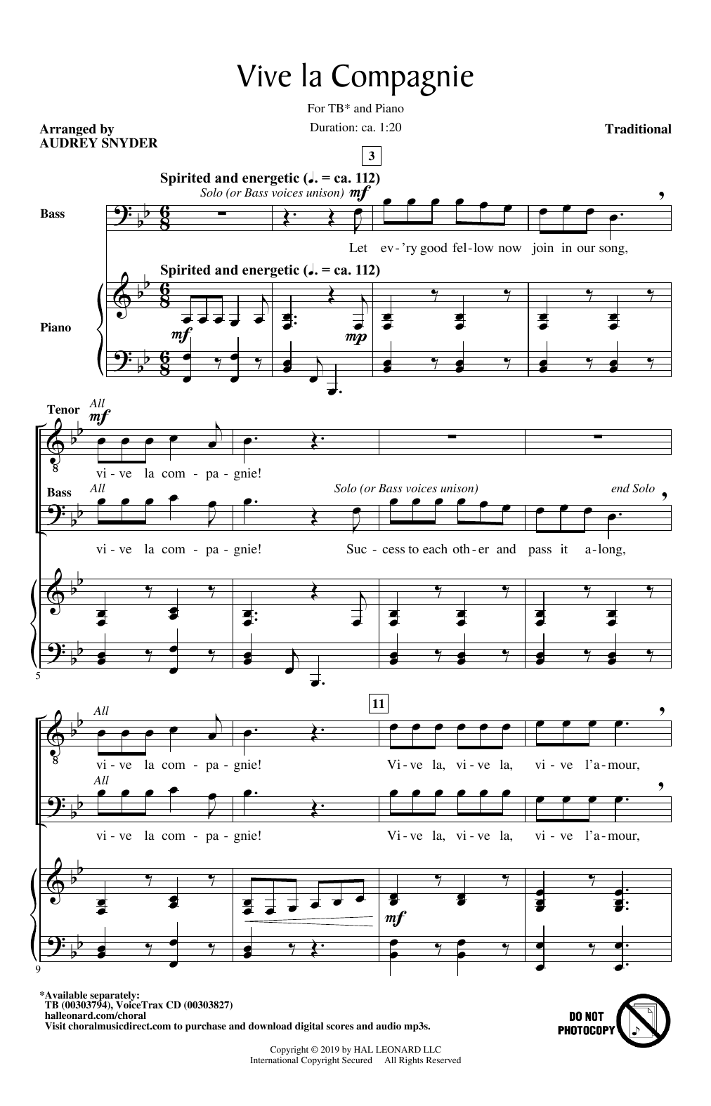 Download or print Traditional Vive La Compagnie (arr. Audrey Snyder) sheet music, chords and digital score arranged for TB Choir. This Traditional score includes 7 page(s).