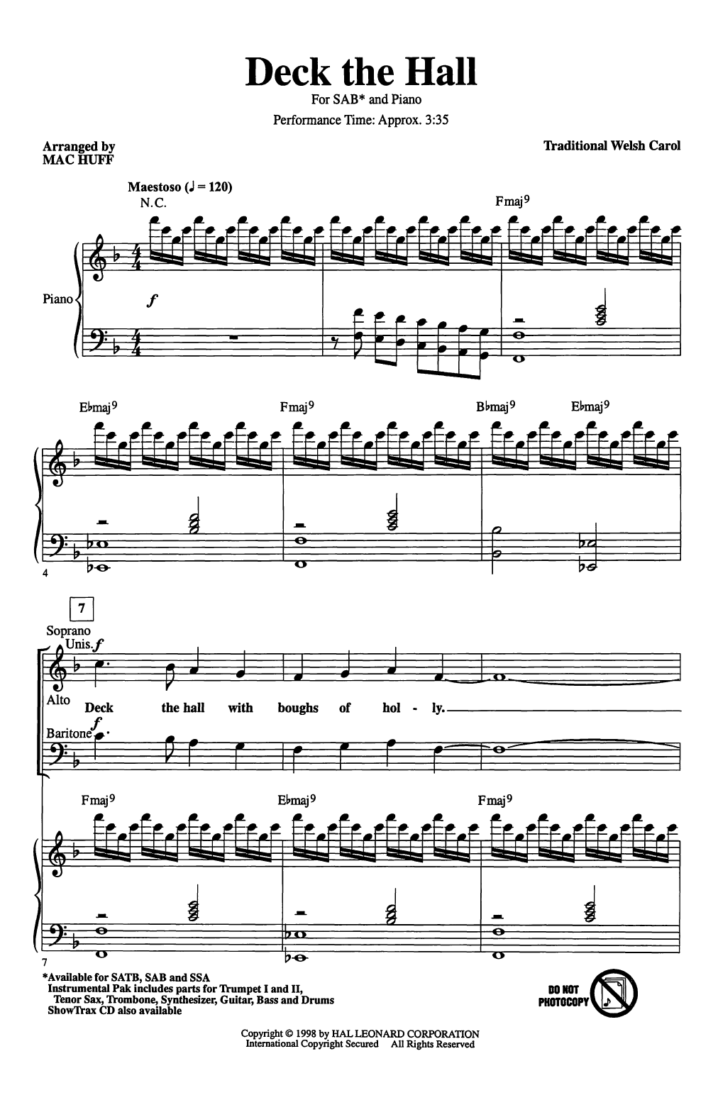 Download or print Traditional Welsh Carol Deck The Hall (arr. Mac Huff) sheet music, chords and digital score arranged for SAB Choir. This Christmas score includes 18 page(s).