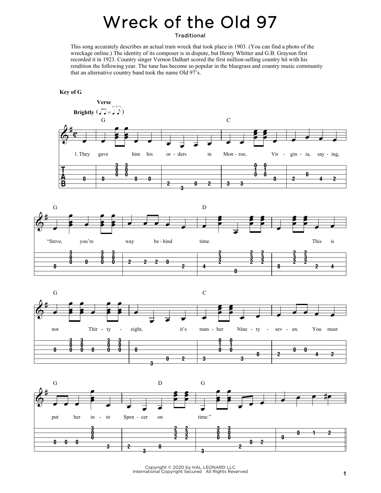 Download or print Traditional Wreck Of The Old 97 (arr. Fred Sokolow) sheet music, chords and digital score arranged for Solo Guitar. This Country score includes 2 page(s).