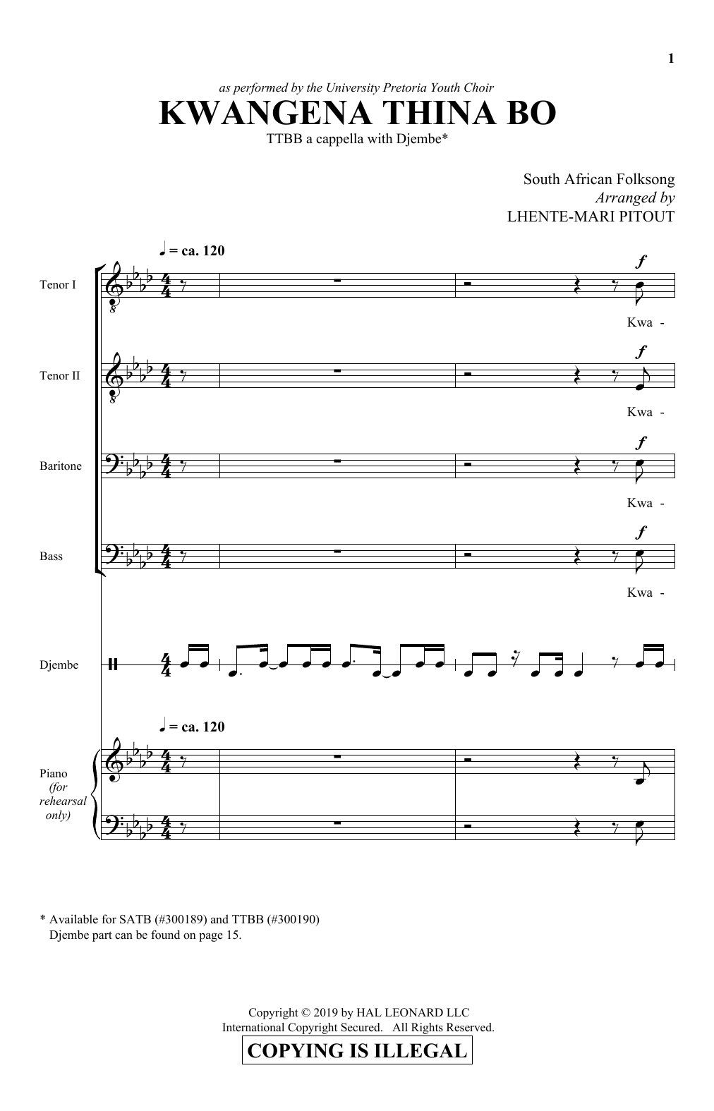 Download or print Traditional Xhosa Folk Song Kwangena Thina Bo (arr. Lhente-Mari Pitout) sheet music, chords and digital score arranged for TTBB Choir. This Concert score includes 13 page(s).