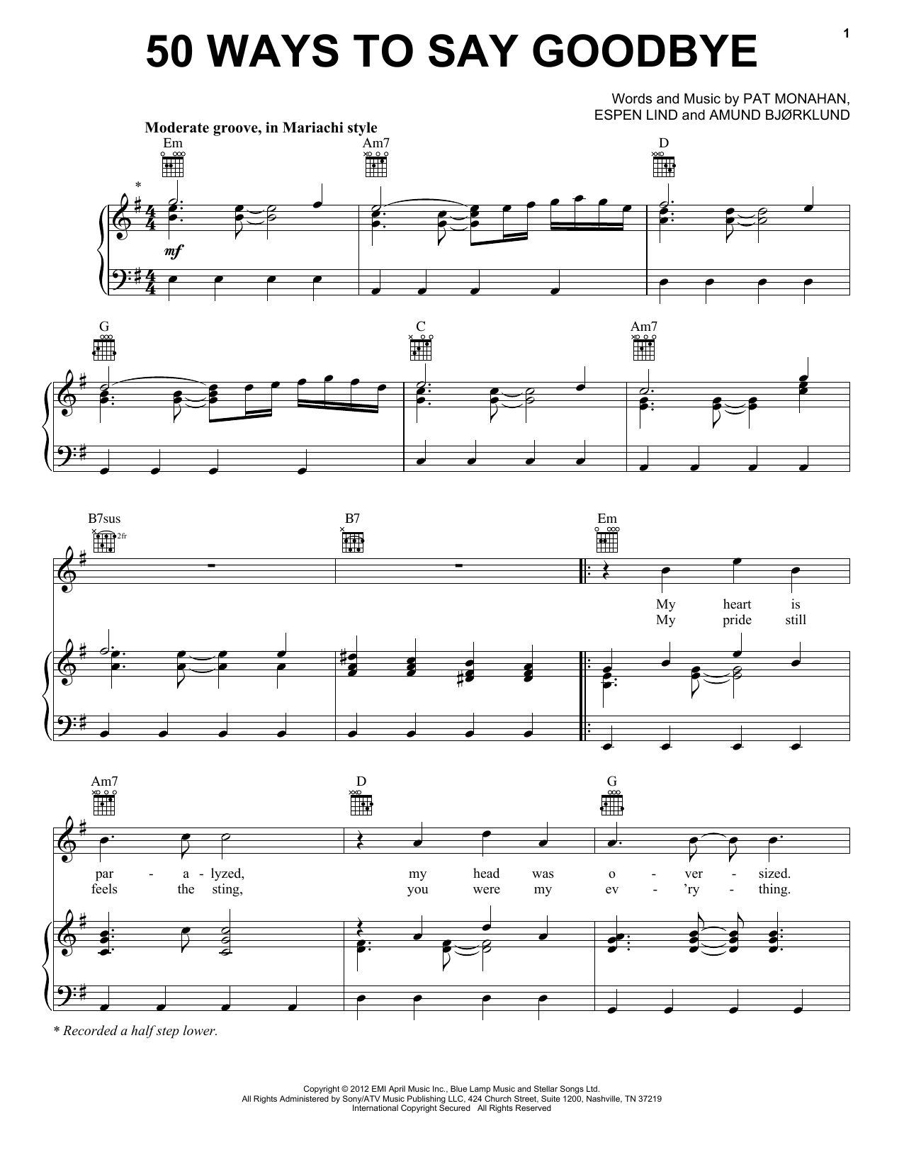 Download or print Train 50 Ways To Say Goodbye sheet music, chords and digital score arranged for Easy Piano. This Rock score includes 8 page(s).