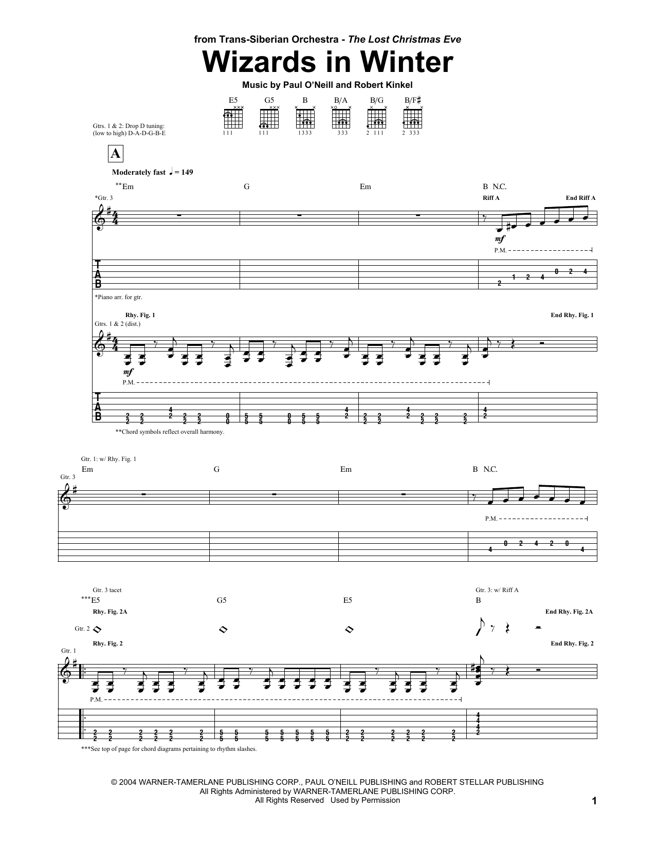 Download or print Trans-Siberian Orchestra Wizards In Winter sheet music, chords and digital score arranged for Guitar Tab. This Christmas score includes 7 page(s).