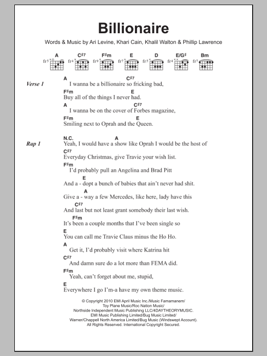 Download or print Travie McCoy Billionaire (feat. Bruno Mars) sheet music, chords and digital score arranged for Guitar Chords/Lyrics. This Pop score includes 2 page(s).