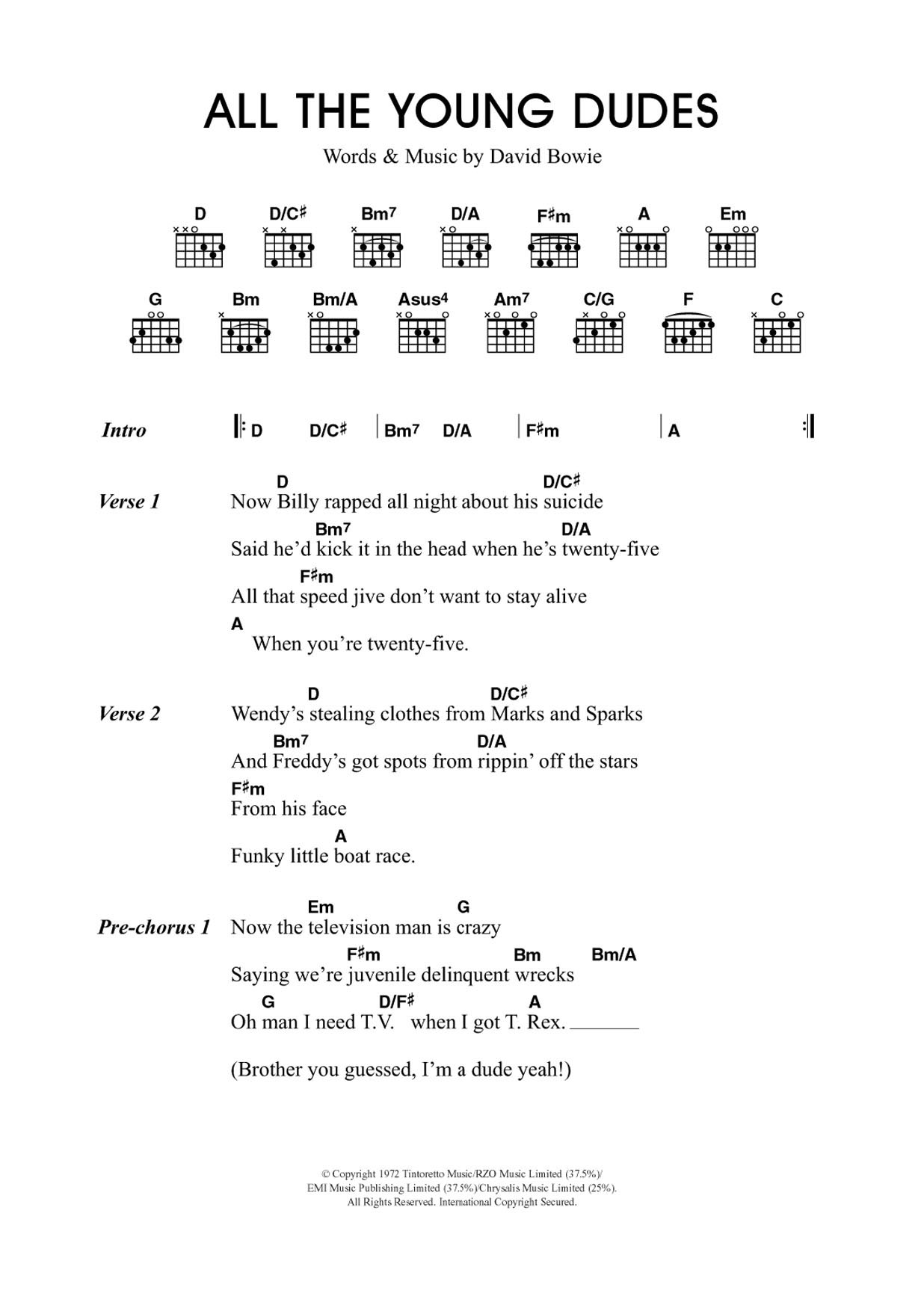 Download or print Travis All The Young Dudes sheet music, chords and digital score arranged for Guitar Chords/Lyrics. This Rock score includes 2 page(s).