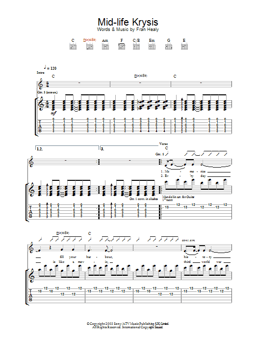 Download or print Travis Mid-life Krysis sheet music, chords and digital score arranged for Guitar Tab. This Pop score includes 5 page(s).