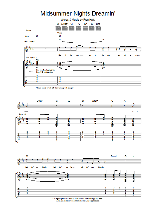 Download or print Travis Midsummer Nights Dreamin' sheet music, chords and digital score arranged for Guitar Tab. This Pop score includes 10 page(s).
