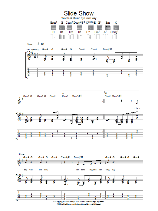 Download or print Travis Slide Show sheet music, chords and digital score arranged for Guitar Tab. This Pop score includes 7 page(s).