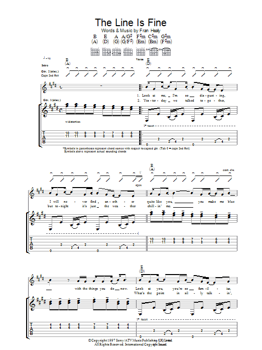 Download or print Travis The Line Is Fine sheet music, chords and digital score arranged for Guitar Tab. This Pop score includes 8 page(s).