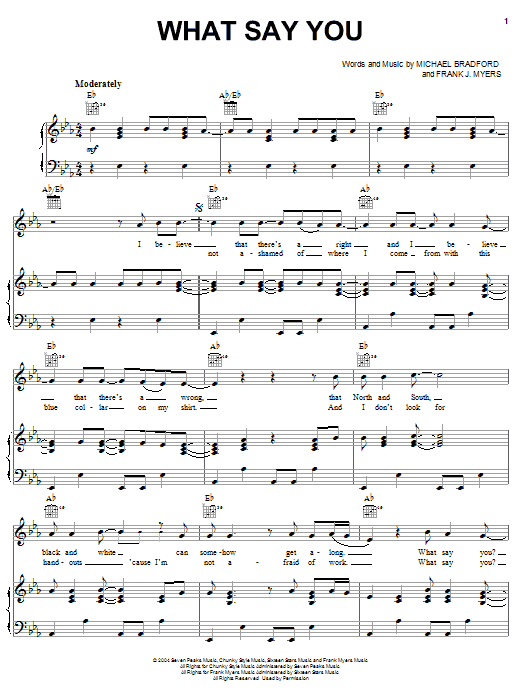 Download or print Travis Tritt with John Mellencamp What Say You sheet music, chords and digital score arranged for Piano, Vocal & Guitar Chords (Right-Hand Melody). This Country score includes 6 page(s).