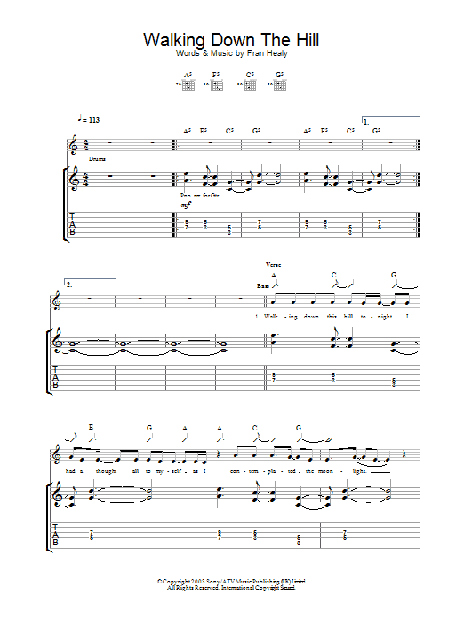 Download or print Travis Walking Down The Hill sheet music, chords and digital score arranged for Guitar Tab. This Pop score includes 4 page(s).