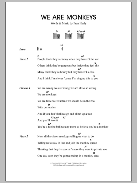 Download or print Travis We Are Monkeys sheet music, chords and digital score arranged for Guitar Chords/Lyrics. This Rock score includes 2 page(s).