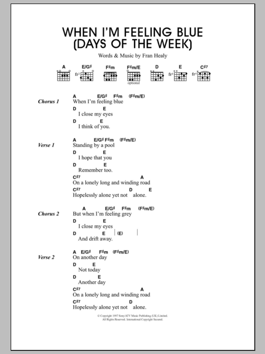 Download or print Travis When I'm Feeling Blue (Seven Days Of The Week) sheet music, chords and digital score arranged for Guitar Chords/Lyrics. This Rock score includes 2 page(s).