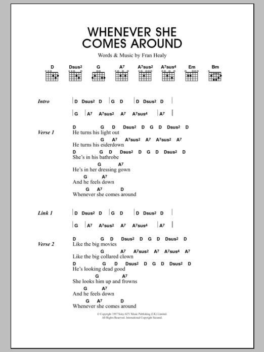 Download or print Travis Whenever She Comes Around sheet music, chords and digital score arranged for Guitar Chords/Lyrics. This Rock score includes 2 page(s).