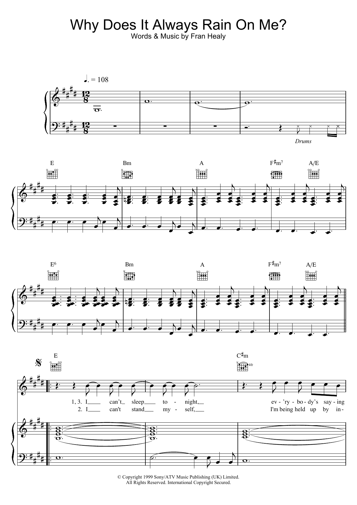 Download or print Travis Why Does It Always Rain On Me? sheet music, chords and digital score arranged for Lead Sheet / Fake Book. This Pop score includes 3 page(s).