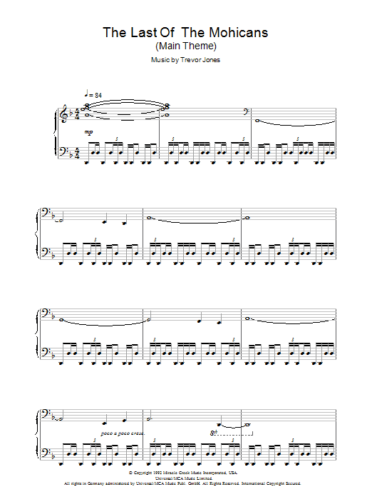 Download or print Trevor Jones The Last Of The Mohicans (Main Title) sheet music, chords and digital score arranged for Piano Solo. This Film/TV score includes 4 page(s).