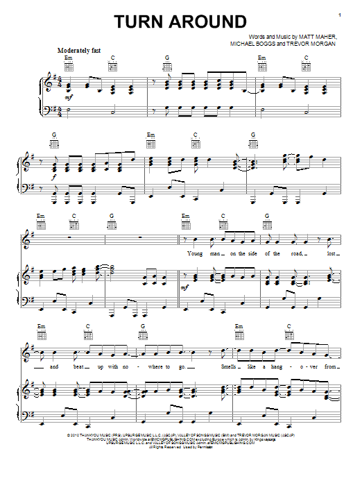 Download or print Trevor Morgan Turn Around sheet music, chords and digital score arranged for Piano, Vocal & Guitar Chords (Right-Hand Melody). This Christian score includes 9 page(s).
