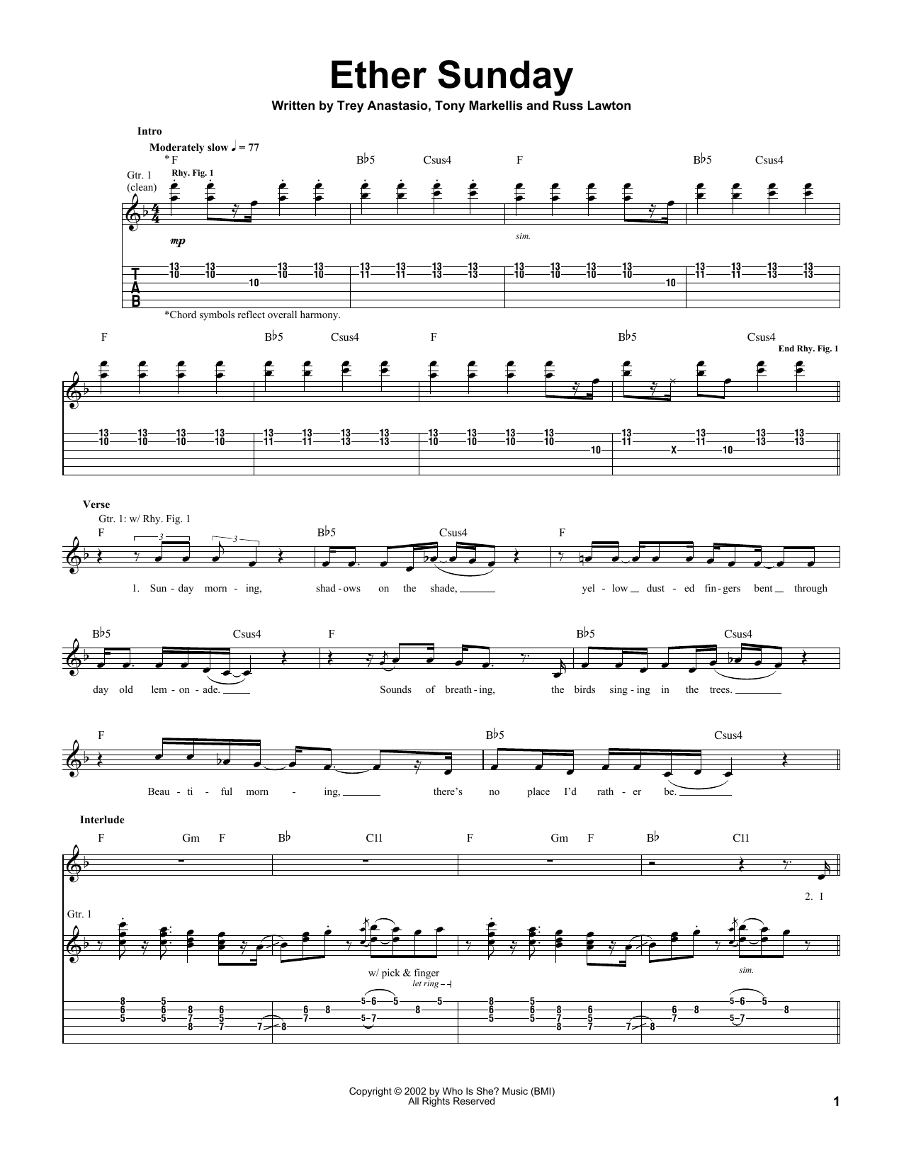 Download or print Trey Anastasio Ether Sunday sheet music, chords and digital score arranged for Guitar Tab. This Rock score includes 3 page(s).