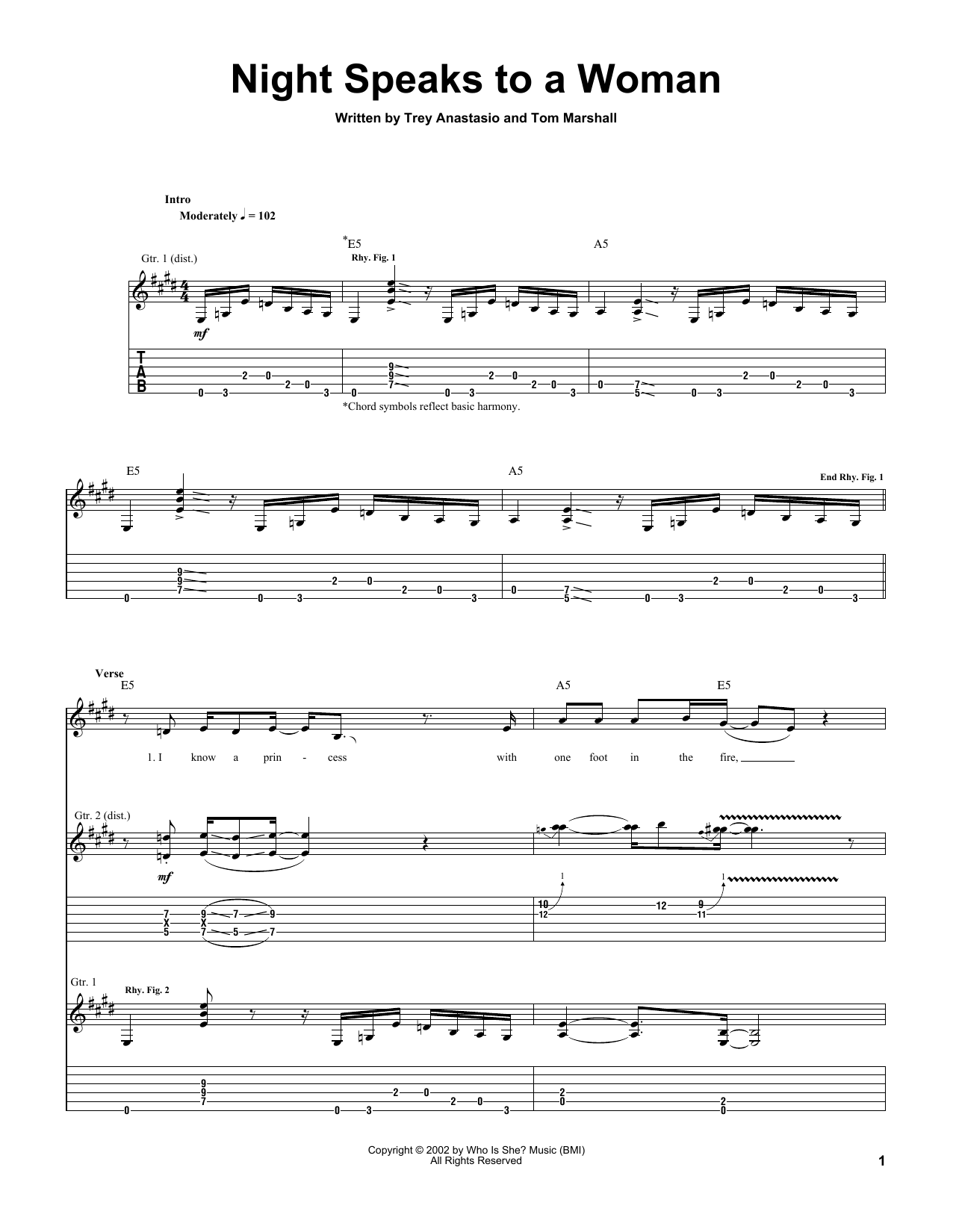 Download or print Trey Anastasio Night Speaks To A Woman sheet music, chords and digital score arranged for Guitar Tab. This Rock score includes 9 page(s).