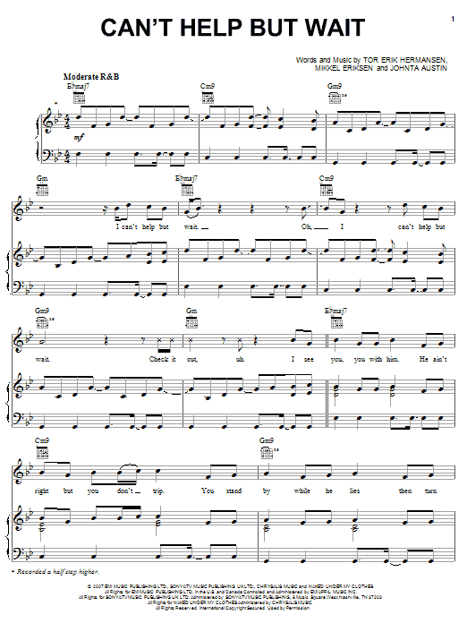 Download or print Trey Songz Can't Help But Wait sheet music, chords and digital score arranged for Piano, Vocal & Guitar Chords (Right-Hand Melody). This Hip-Hop score includes 6 page(s).