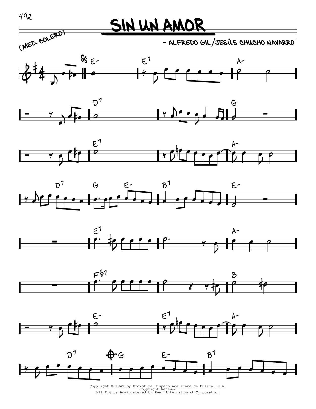 Download or print Trio Los Panchos Sin Un Amor sheet music, chords and digital score arranged for Piano, Vocal & Guitar Chords (Right-Hand Melody). This Latin score includes 7 page(s).