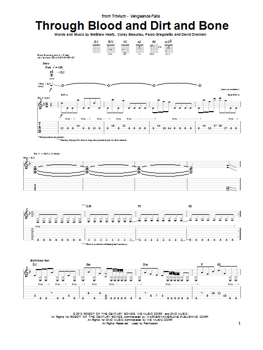 Download or print Trivium Through Blood And Dirt And Bone sheet music, chords and digital score arranged for Guitar Tab. This Metal score includes 7 page(s).