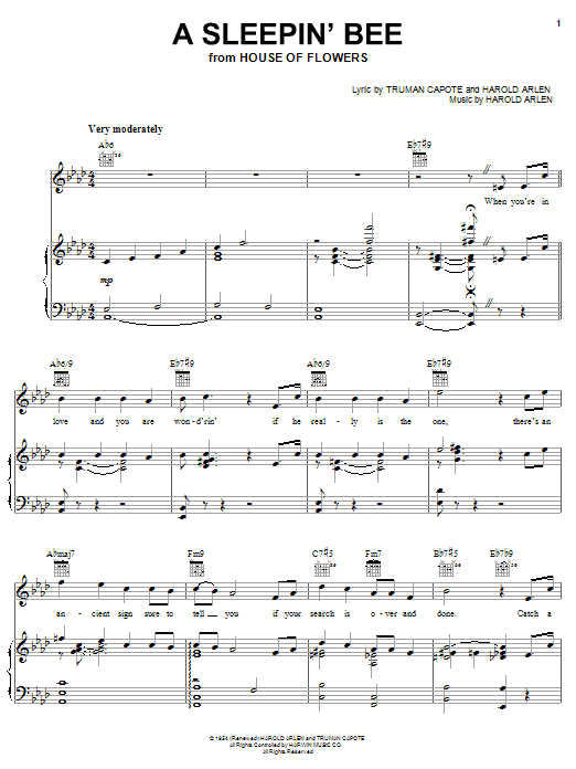 Download or print Truman Capote A Sleepin' Bee sheet music, chords and digital score arranged for Piano, Vocal & Guitar Chords (Right-Hand Melody). This Standards score includes 4 page(s).