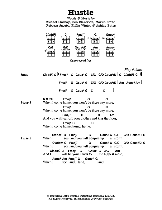 Download or print Tunng Hustle sheet music, chords and digital score arranged for Guitar Chords/Lyrics. This Pop score includes 2 page(s).