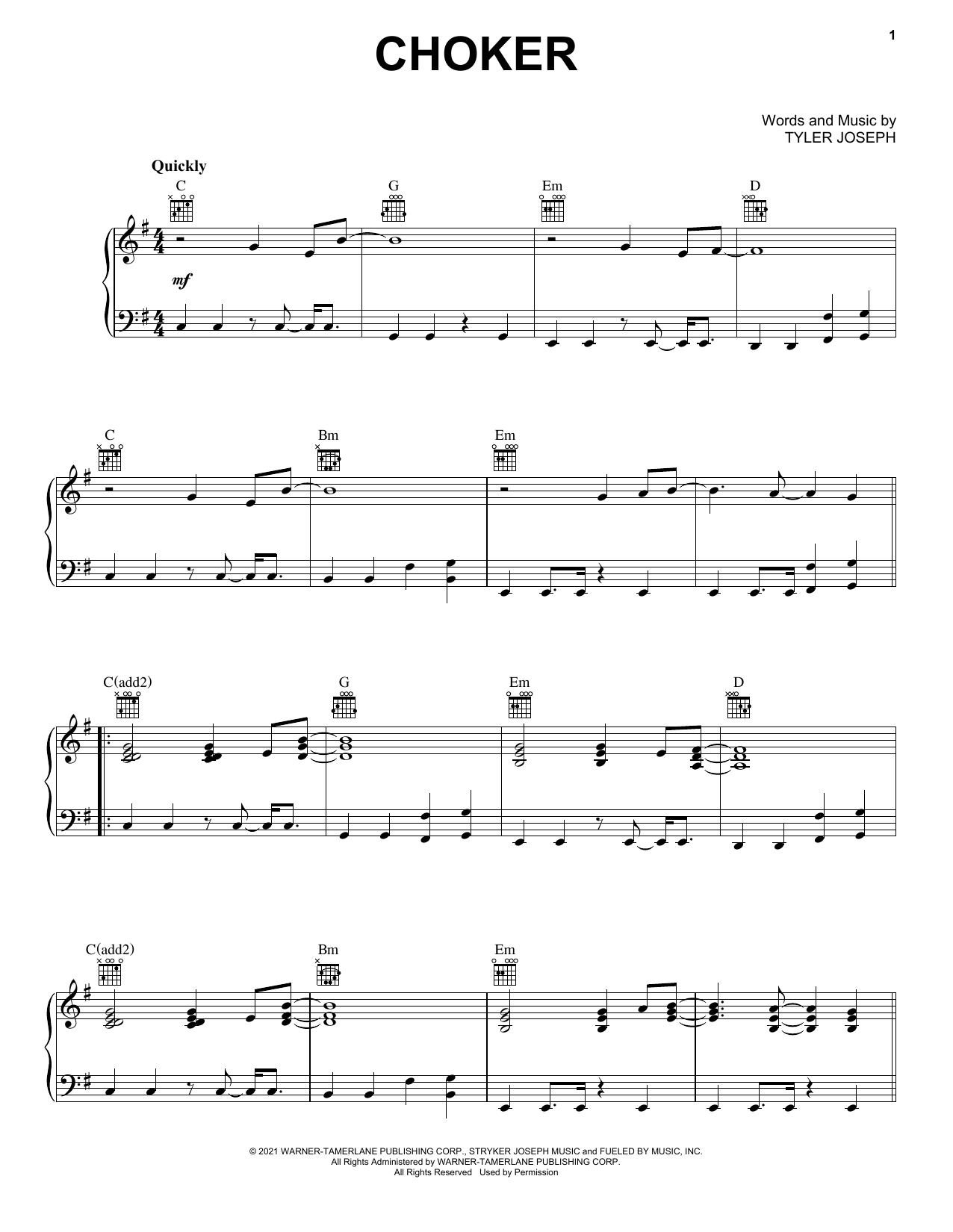 Download or print Twenty One Pilots Choker sheet music, chords and digital score arranged for Piano, Vocal & Guitar Chords (Right-Hand Melody). This Pop score includes 6 page(s).