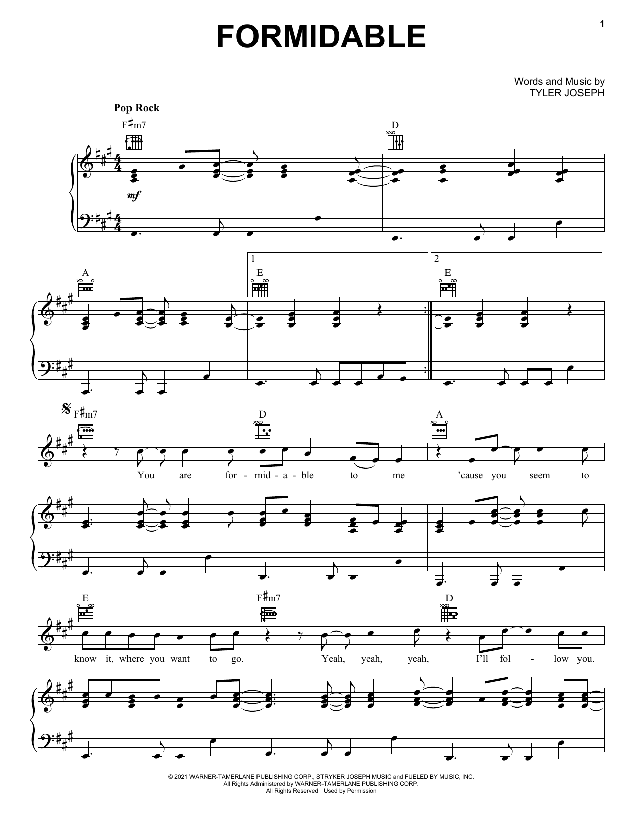 Download or print Twenty One Pilots Formidable sheet music, chords and digital score arranged for Piano, Vocal & Guitar Chords (Right-Hand Melody). This Rock score includes 7 page(s).