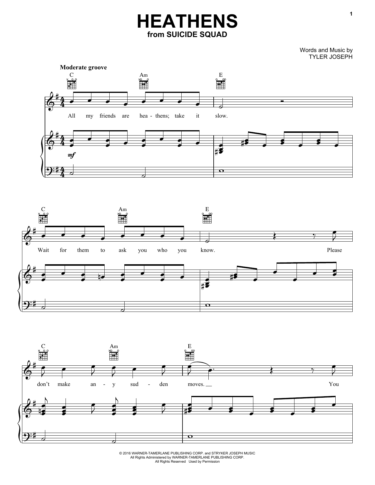 Download or print Twenty One Pilots Heathens sheet music, chords and digital score arranged for Drum Chart. This Pop score includes 2 page(s).