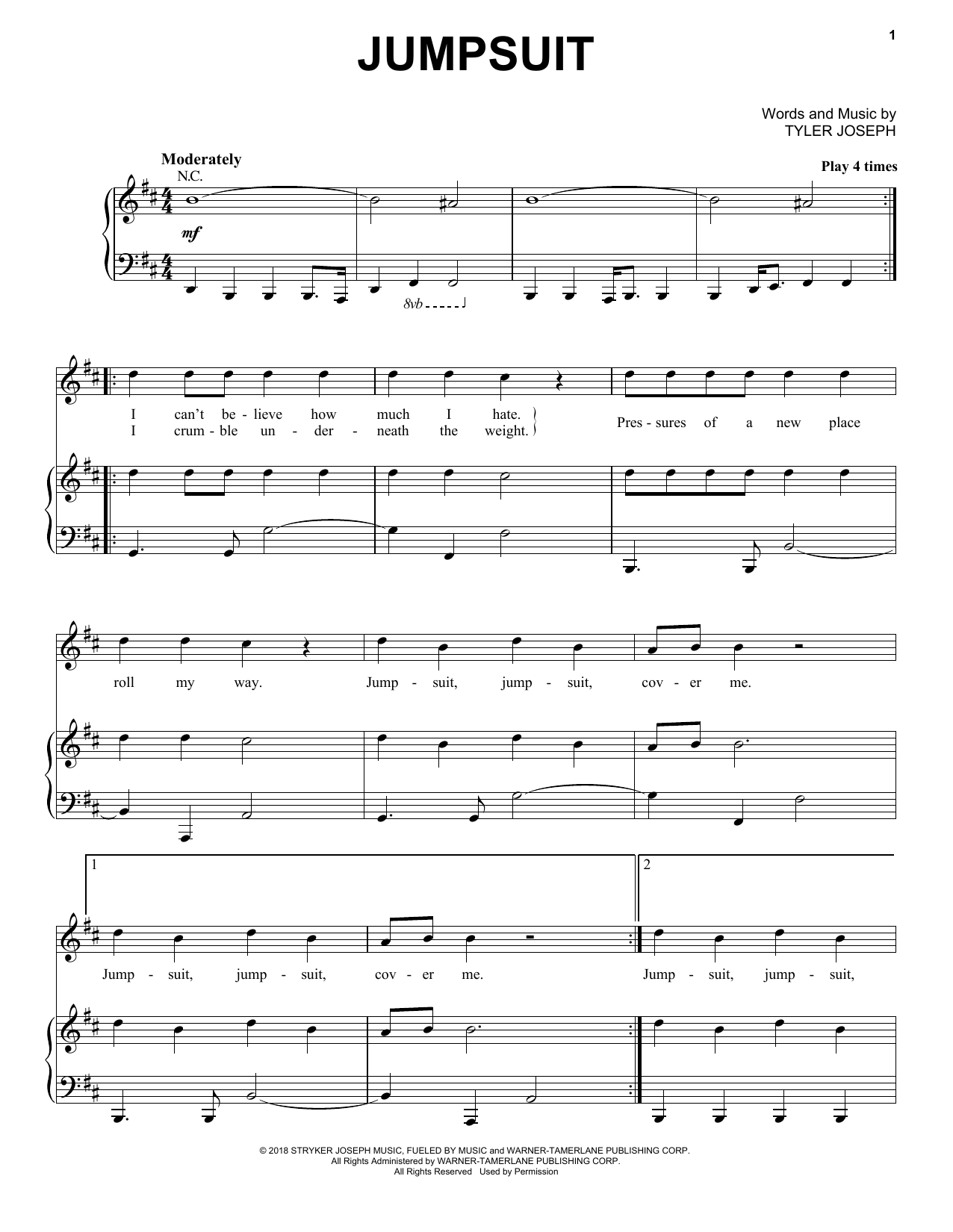 Download or print Twenty One Pilots Jumpsuit sheet music, chords and digital score arranged for Piano & Vocal. This Pop score includes 6 page(s).