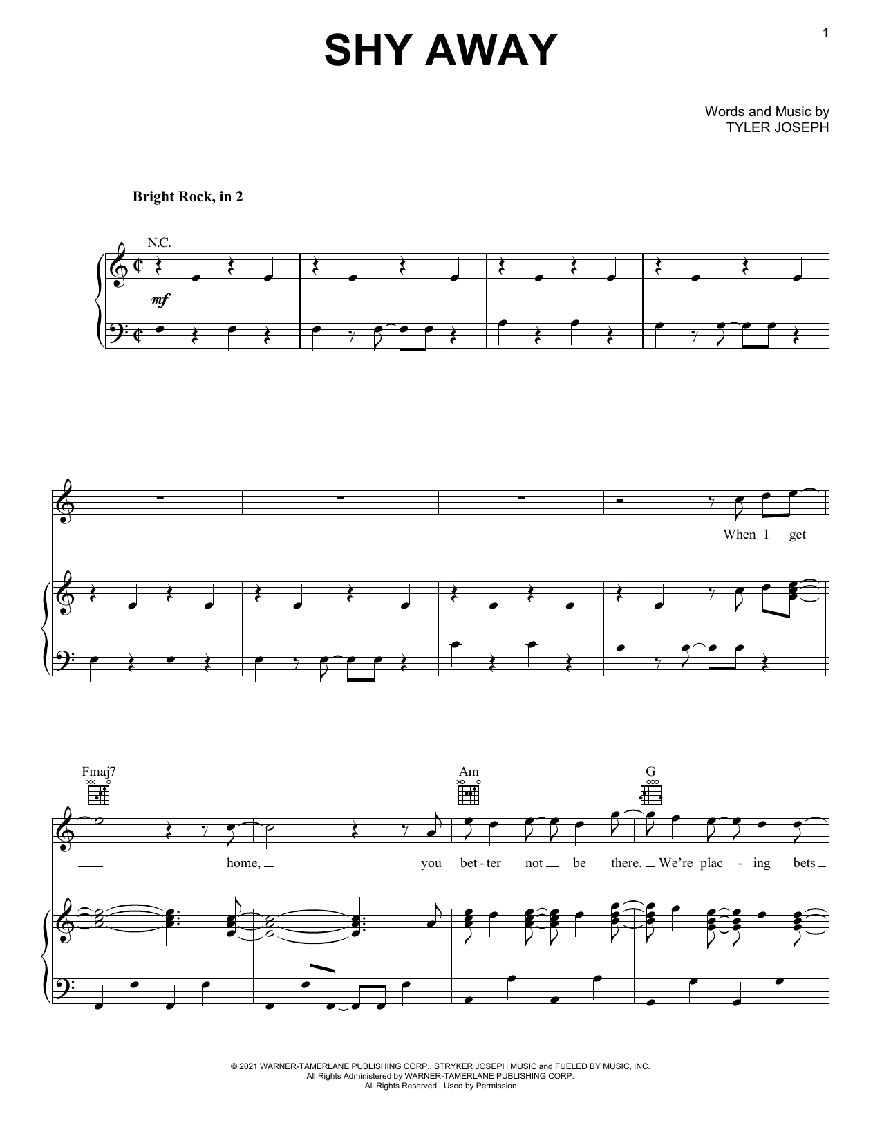 Download or print Twenty One Pilots Shy Away sheet music, chords and digital score arranged for Easy Piano. This Pop score includes 8 page(s).