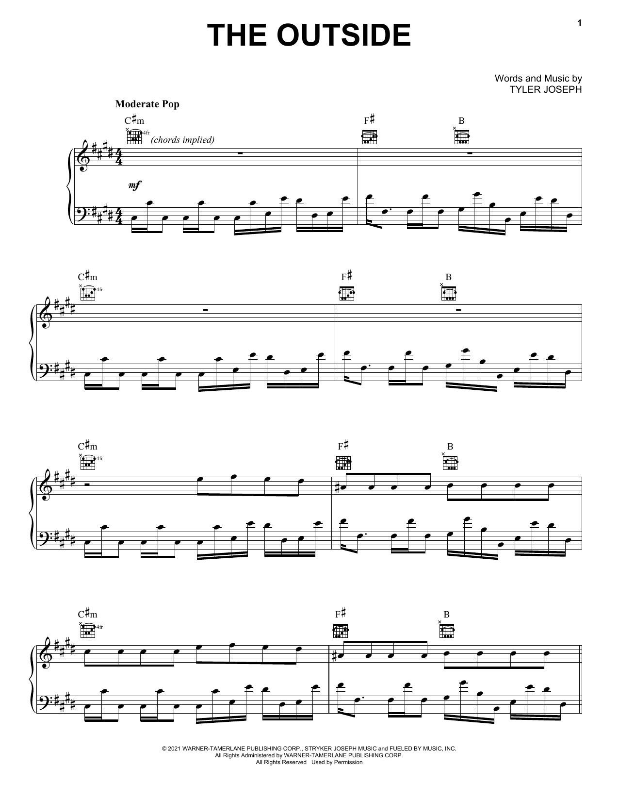 Download or print Twenty One Pilots The Outside sheet music, chords and digital score arranged for Piano, Vocal & Guitar Chords (Right-Hand Melody). This Rock score includes 8 page(s).
