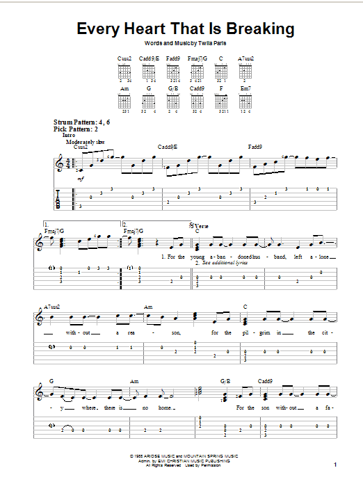 Download or print Twila Paris Every Heart That Is Breaking sheet music, chords and digital score arranged for Piano, Vocal & Guitar Chords (Right-Hand Melody). This Christian score includes 6 page(s).