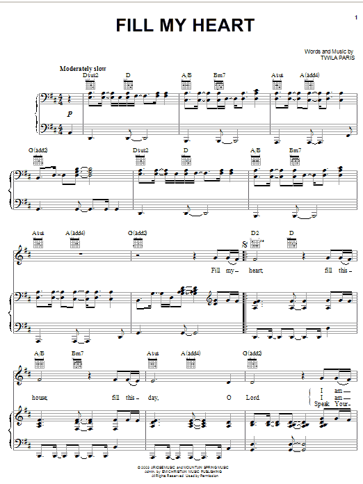 Download or print Twila Paris Fill My Heart sheet music, chords and digital score arranged for Piano, Vocal & Guitar Chords (Right-Hand Melody). This Pop score includes 6 page(s).