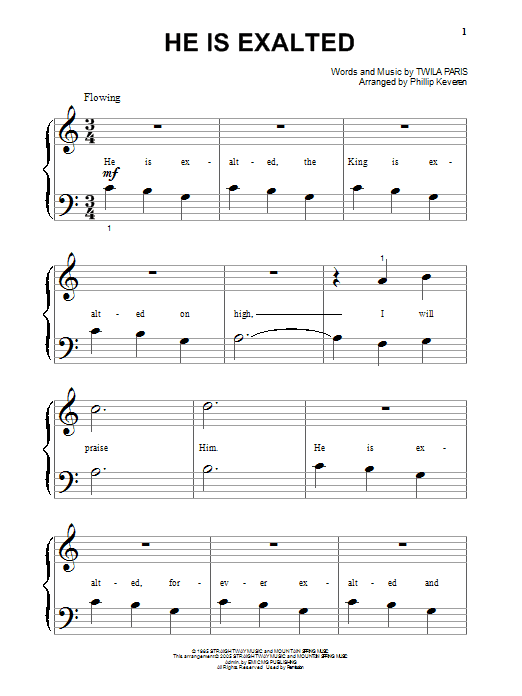 Download or print Twila Paris He Is Exalted (arr. Phillip Keveren) sheet music, chords and digital score arranged for Beginning Piano Solo. This Children score includes 3 page(s).