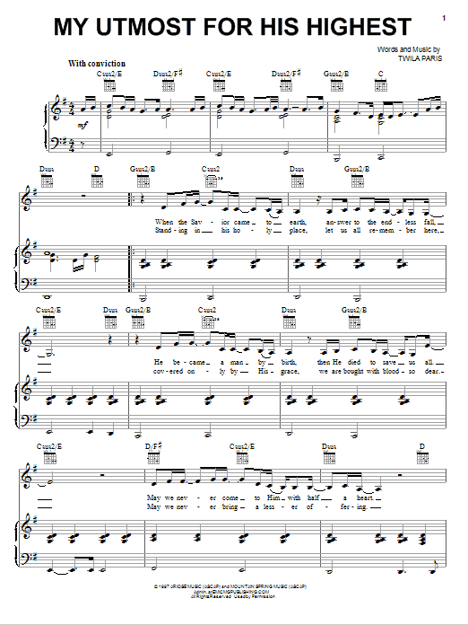 Download or print Twila Paris My Utmost For His Highest sheet music, chords and digital score arranged for Piano, Vocal & Guitar Chords (Right-Hand Melody). This Christian score includes 4 page(s).