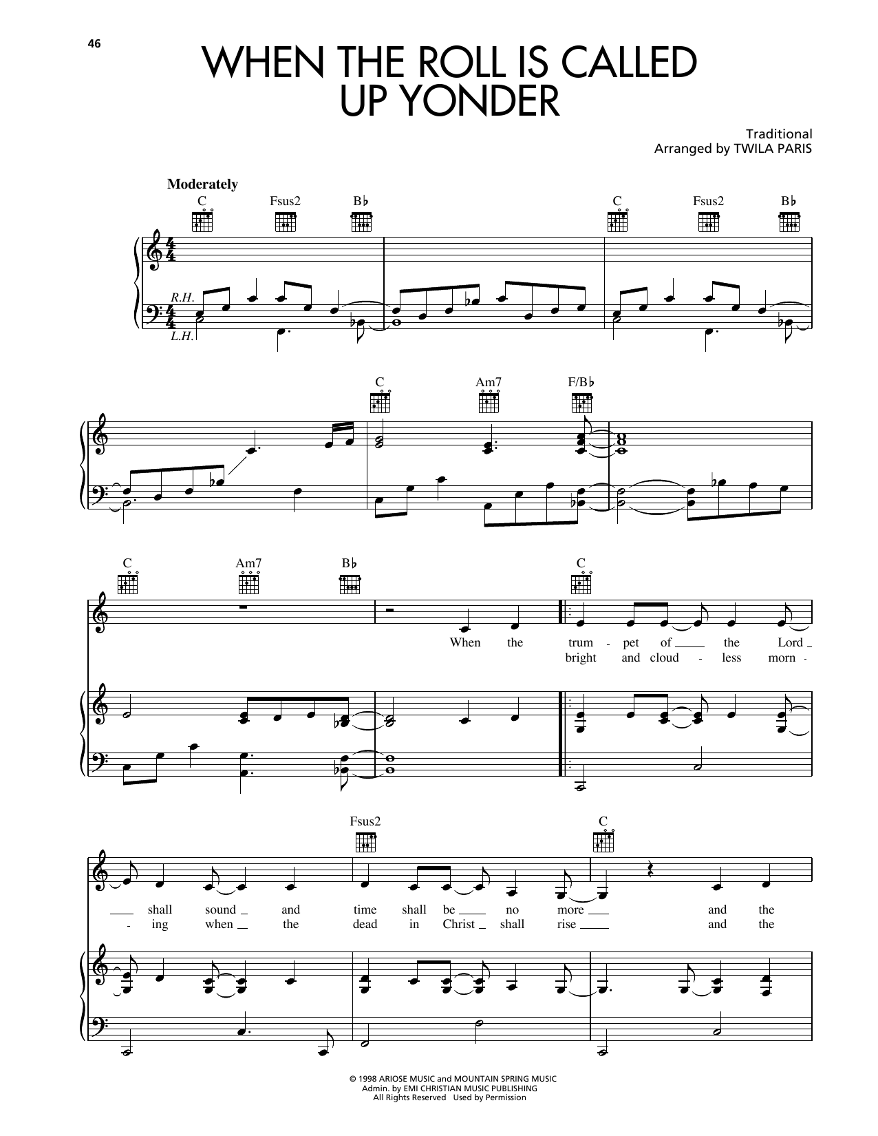 Download or print Twila Paris When The Roll Is Called Up Yonder sheet music, chords and digital score arranged for Piano, Vocal & Guitar Chords (Right-Hand Melody). This Christian score includes 7 page(s).