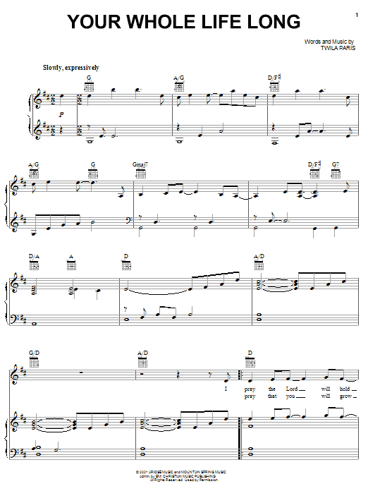 Download or print Twila Paris Your Whole Life Long sheet music, chords and digital score arranged for Piano, Vocal & Guitar Chords (Right-Hand Melody). This Christian score includes 7 page(s).