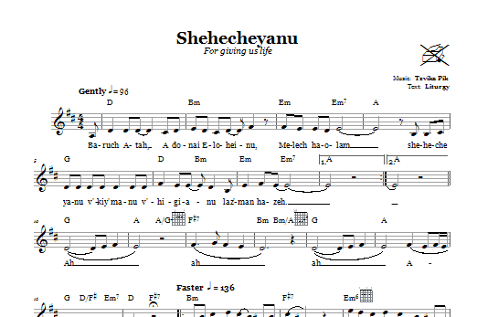 Download or print Tzvika Pik Shehecheyanu (For Giving Us Life) sheet music, chords and digital score arranged for Lead Sheet / Fake Book. This Traditional score includes 1 page(s).