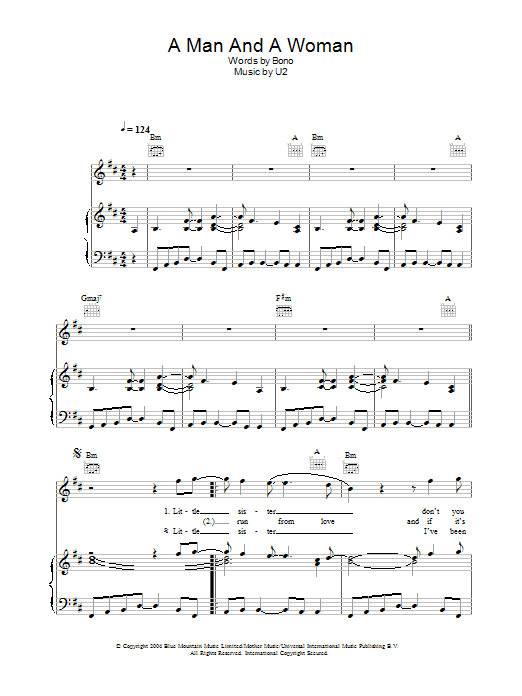 Download or print U2 A Man And A Woman sheet music, chords and digital score arranged for Guitar Tab. This Pop score includes 6 page(s).