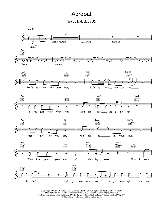 Download or print U2 Acrobat sheet music, chords and digital score arranged for Piano, Vocal & Guitar Chords (Right-Hand Melody). This Pop score includes 11 page(s).
