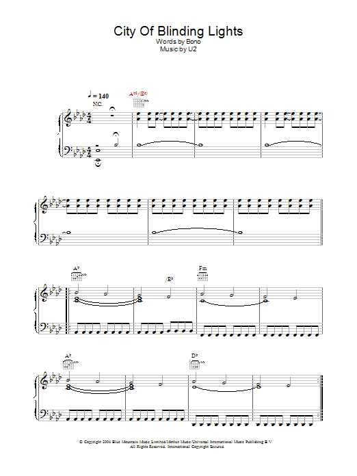 Download or print U2 City Of Blinding Lights sheet music, chords and digital score arranged for Guitar Tab. This Pop score includes 9 page(s).