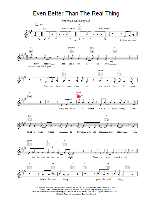 Download or print U2 Even Better Than The Real Thing sheet music, chords and digital score arranged for Piano, Vocal & Guitar Chords (Right-Hand Melody). This Pop score includes 7 page(s).