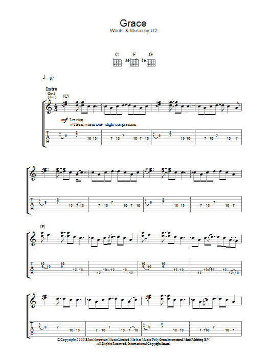 Download or print U2 Grace sheet music, chords and digital score arranged for Guitar Tab. This Rock score includes 5 page(s).